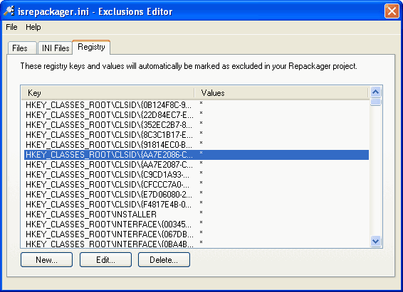 The Registry tab contains a list of keys and values to be excluded during registry analysis. For keys that have specific values excluded, the value name appears in the Value column. For keys that have all values excluded, an asterisk (*) represents the entire key in the Value column.