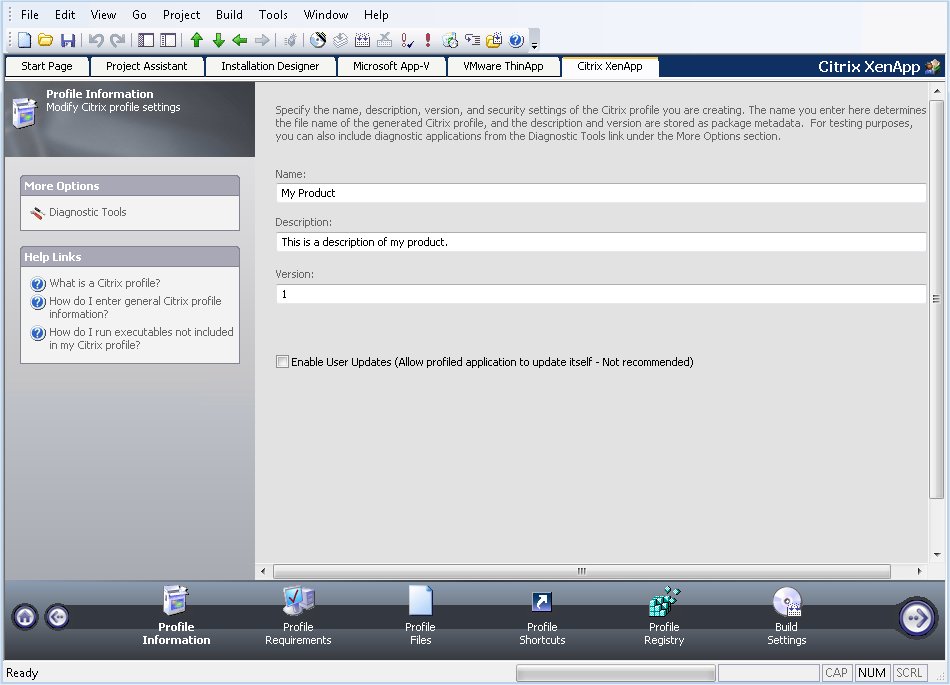 On the Profile Information page in the Citrix Assistant, you specify the Name, Description, and Version of the Citrix profile you are creating. This page is also where you specify whether users can update applications.