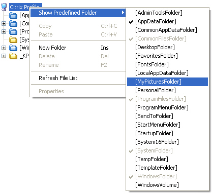 - In the Citrix Profile tree, select the Citrix Profile node (or any of the files or folders that are listed, point to Show Predefined Folder. A list of predefined folders opens.