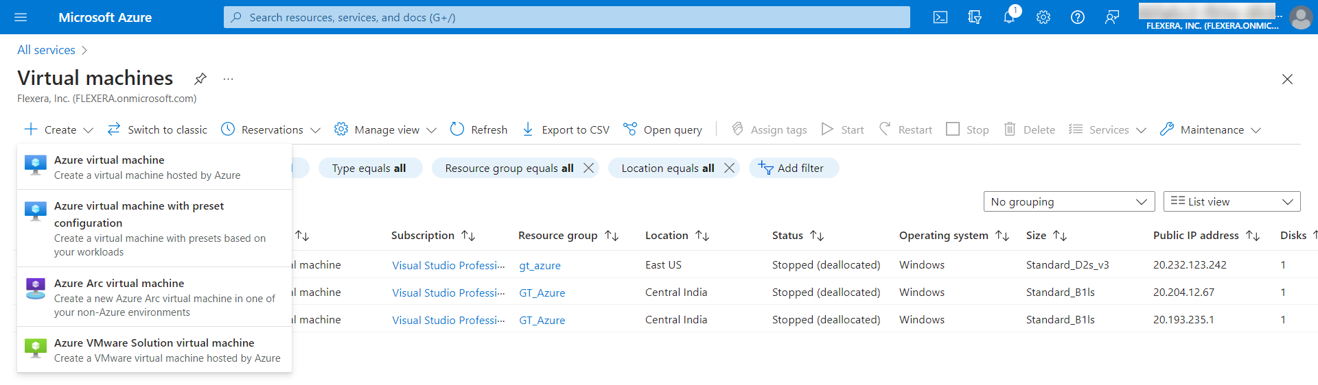 From the list of available Azure services, choose Virtual Machines. The Virtual Machines page appears.
