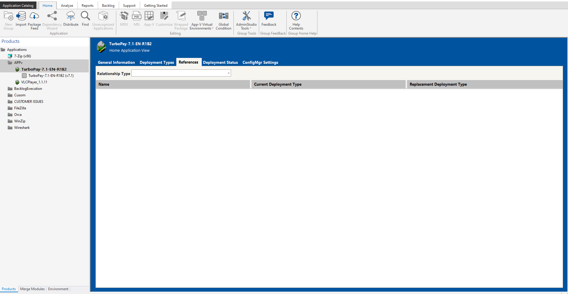 Relationship TypeSelect one of the following: Applications that supersede this application —Select to view applications that contain a package which supersedes a package in this application. If both packages were installed on a target machine, the supersedent package would be used. Applications that depend on this application —Select to view applications that contain a package which is dependent upon a package in this application. In order to run properly, the dependent package requires that the package that it is dependent upon be installed on the same target machine. Virtual environments that contain this application —Select to view Virtual Environments that contain App-V packages. For more information, see Creating an App-V Server Virtual Environment and Deployment Data Tab / Virtual Environments Subtab.
