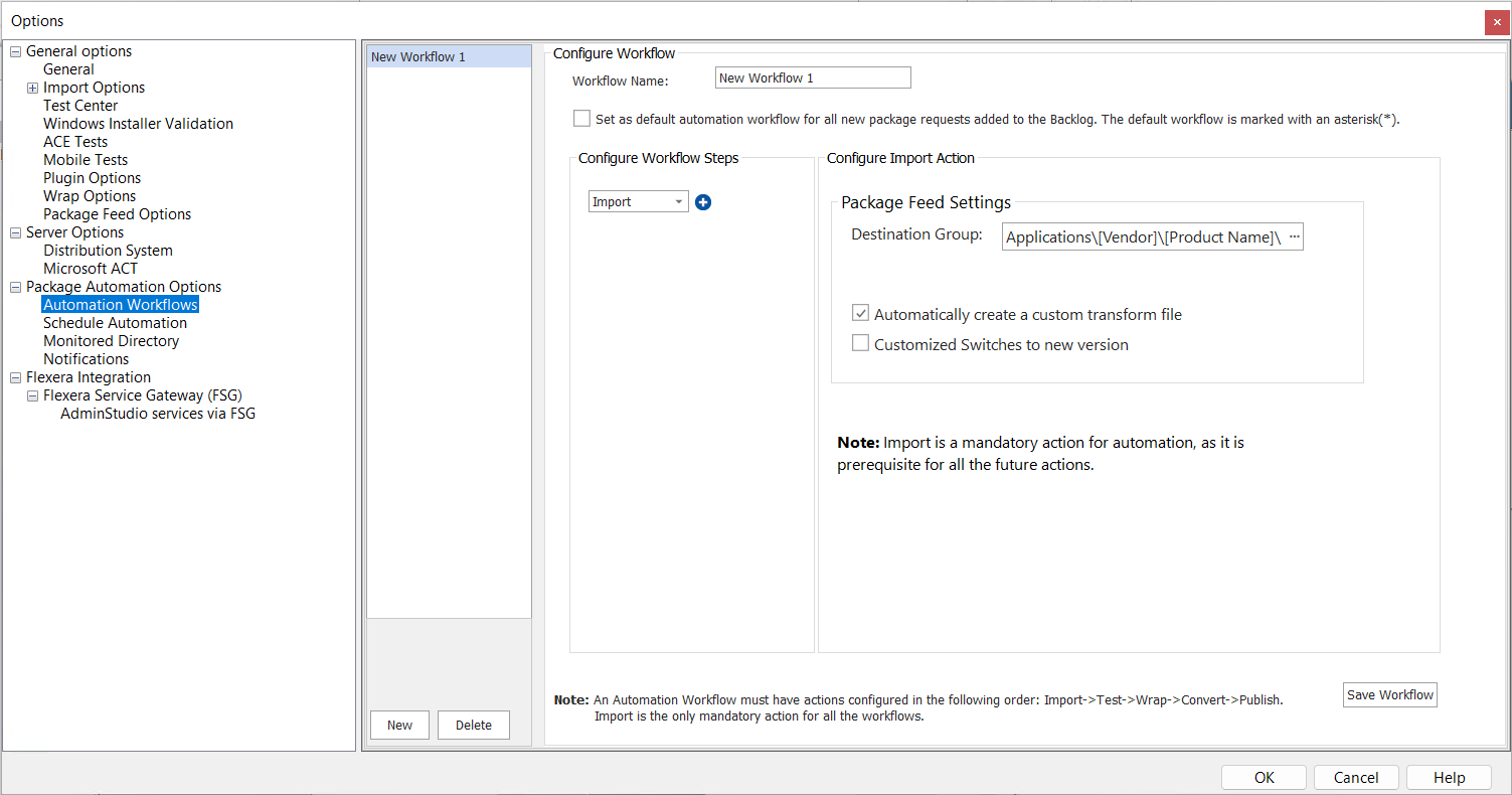 Field Description Workflow Name Enter the valid name of the workflow. Set as default automation workflow for all new package requests added to the Backlog. The default workflow is marked with an asterisk(*) Select this check box to set the workflow as a default automation workflow for all new package requests added to the Backlog. By default, this option will be unchecked. Configure Workflow Steps In configuring workflow step, Importaction will be selected by default. To configure other workflow steps, click\+icon and proceed with respective configuration details. To delete any workflow step, clickxicon beside the workflow steps. Configure the following Workflow steps: Import— To configure Import action, see Configure Import Action for Automation. Test— To configure Test action, see Configure Test Action for Automation. Wrap— To configure Wrap action, see Configure Wrap Action for Automation. Convert— To configure Convert action, see Configure Convert Action for Automation. Publish— To configure Publish action, see Configure Publish Action for Automation. Import is prerequisite for Automation therefore it is a mandatory action. This action will be executed as a first step during automation execution. -