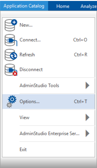 On the Application Catalog tab menu, select Options. The Options dialog box opens.