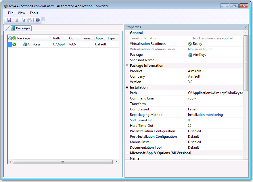 As described in Performing Virtualization and Repackaging Using the Automated Application Converter, you can use the Automated Application Converter tool to convert a single package or a group of packages into Microsoft App-V, VMware ThinApp, Citrix XenApp, MSIX packages and virtual application formats. Using Automated Application Converter to perform this task enables you to make a wide variety of customizations by editing a package’s general and App-V-related properties prior to conversion.