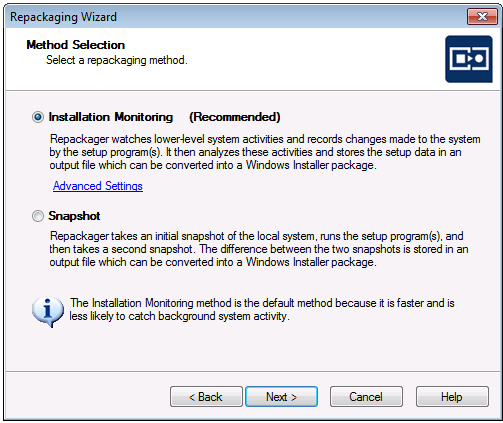 | Installation Monitoring | Installation Monitoring watches all activities generated by an installation, and then determines the files, .ini files, registry entries and shortcuts that should be included in the generated Windows Installer package. Installation Monitoring is significantly faster than the Snapshot repackaging method. If there are services running on the machine that have nothing to do with the installation being repackaged, click the Advanced Settings link to open the Excluded Processes Dialog Box, where you can choose to exclude those processes. The Installation Monitoring Method is included with AdminStudio Professional and Enterprise Editions. If you know that the installation that you are capturing is from a self-extracting .exe file and if you want to use the Installation Monitoring method, you should click Advanced Settings and add the name of that .exe file to the excluded processes list. |