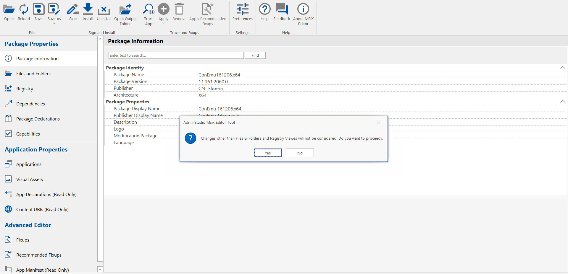 noteIn the modification package, only Package Information, Files and Folders, Registry, and Dependencies views are enabled.
