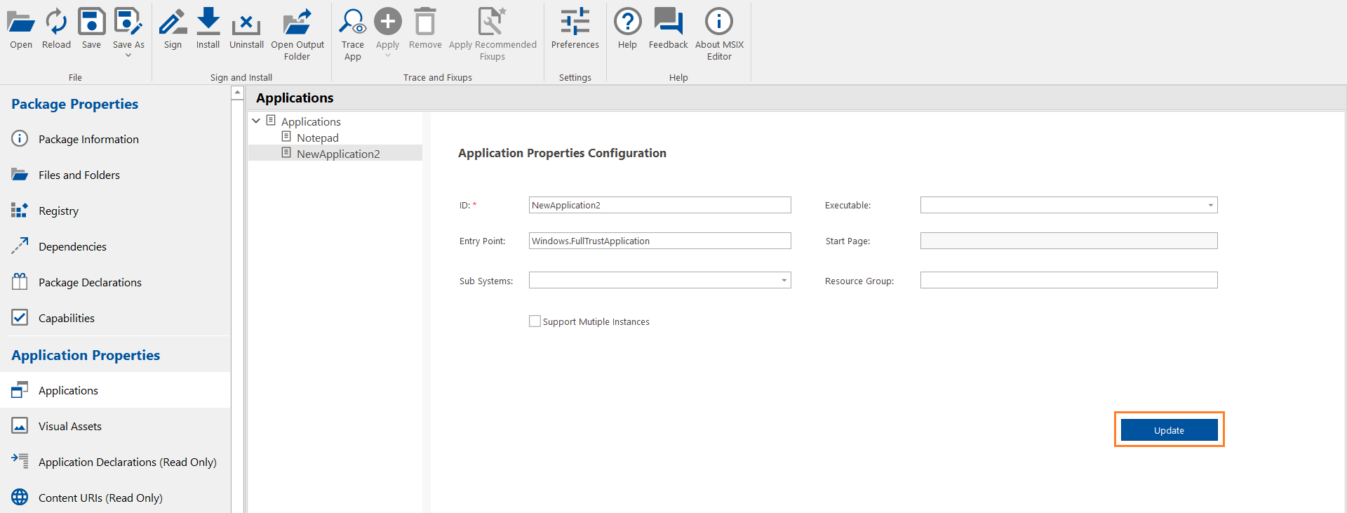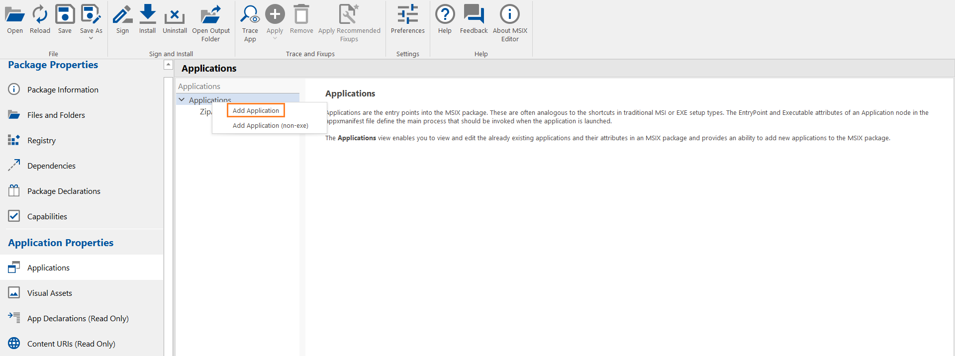 2. Right-click on the Applications node, and then select Add Application from the context menu. ![](/images/MSIX Editor_Appications NewImage1.png)