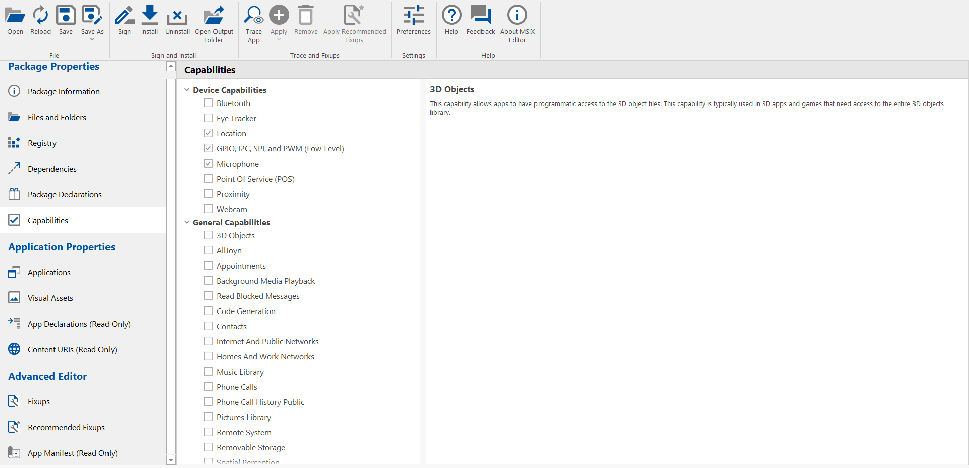 3. Click on the check box button and deselect the capability that you want to remove it from the package manifest file. ![](/images/MSIX Editor_Capabilities NewImage1.png)